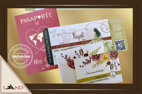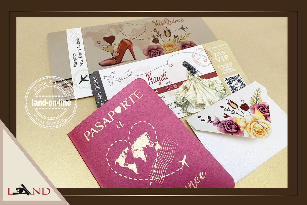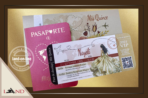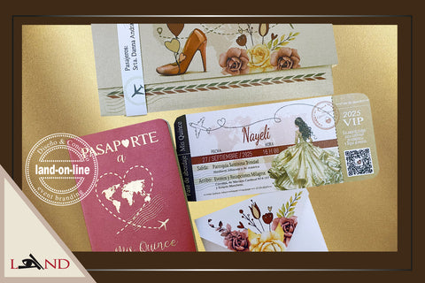 Hermosa invitación con diseño al puro estilo Old Money con foil dorado o pan de oro vibrante en pasaporte que darán a tu invitación un toque auténtico, único y elegante.